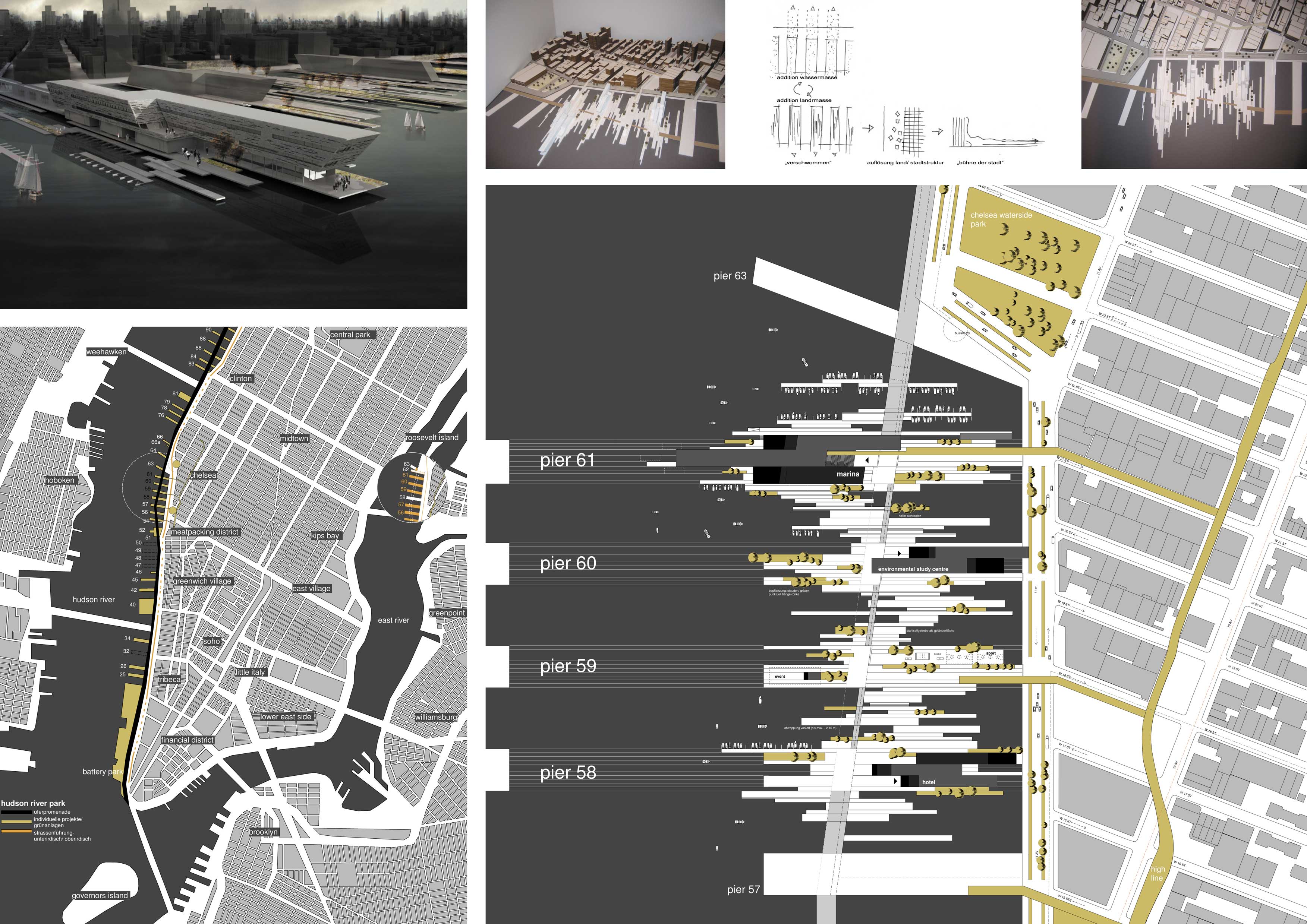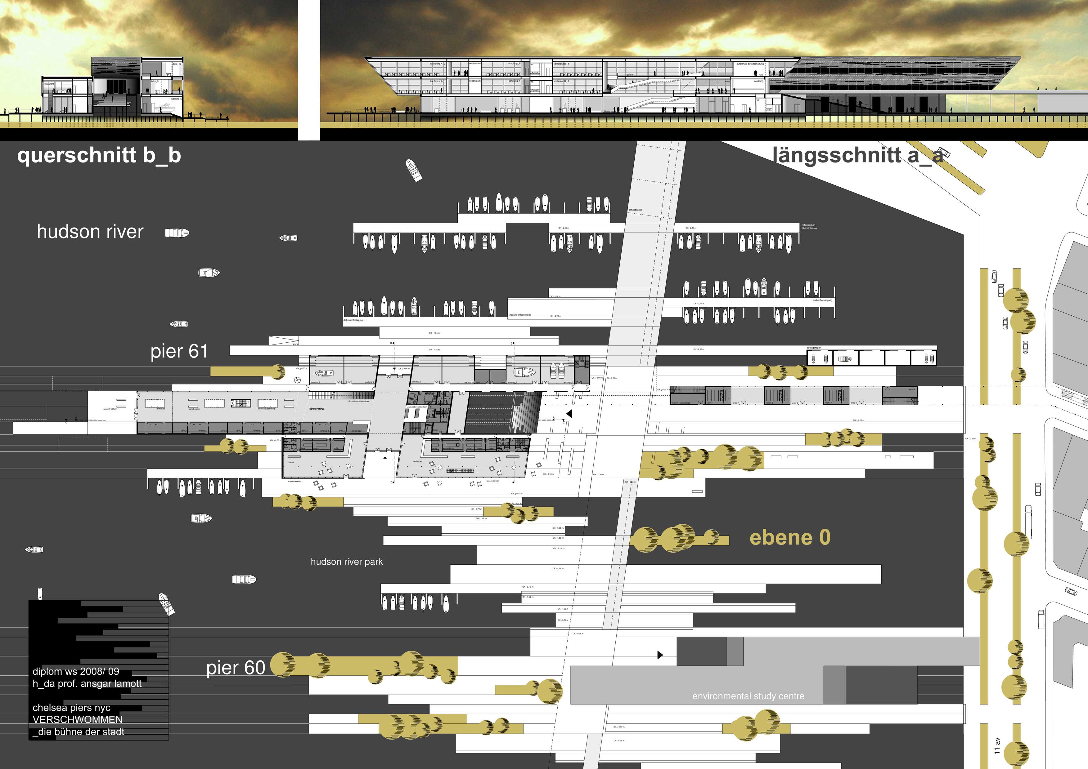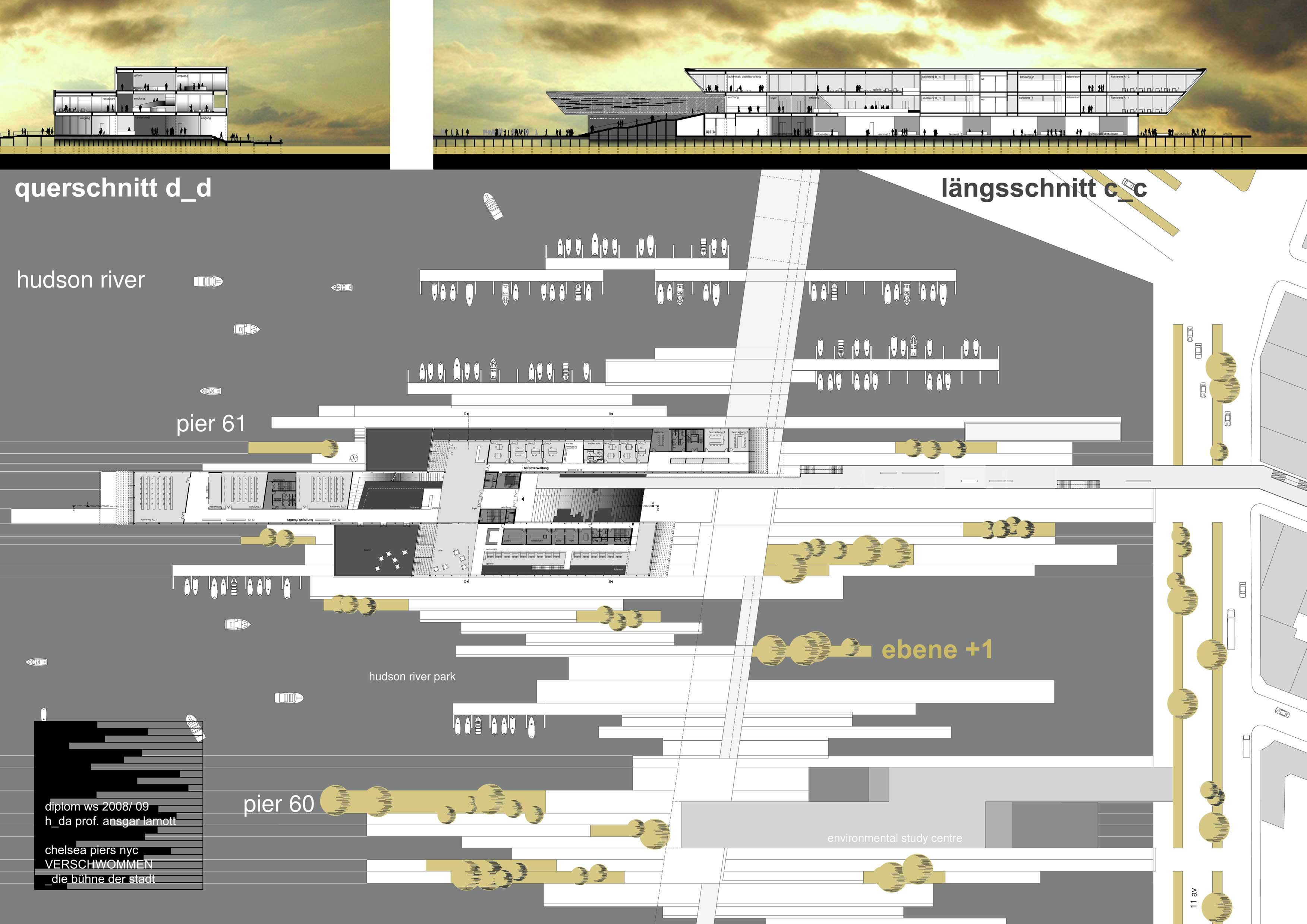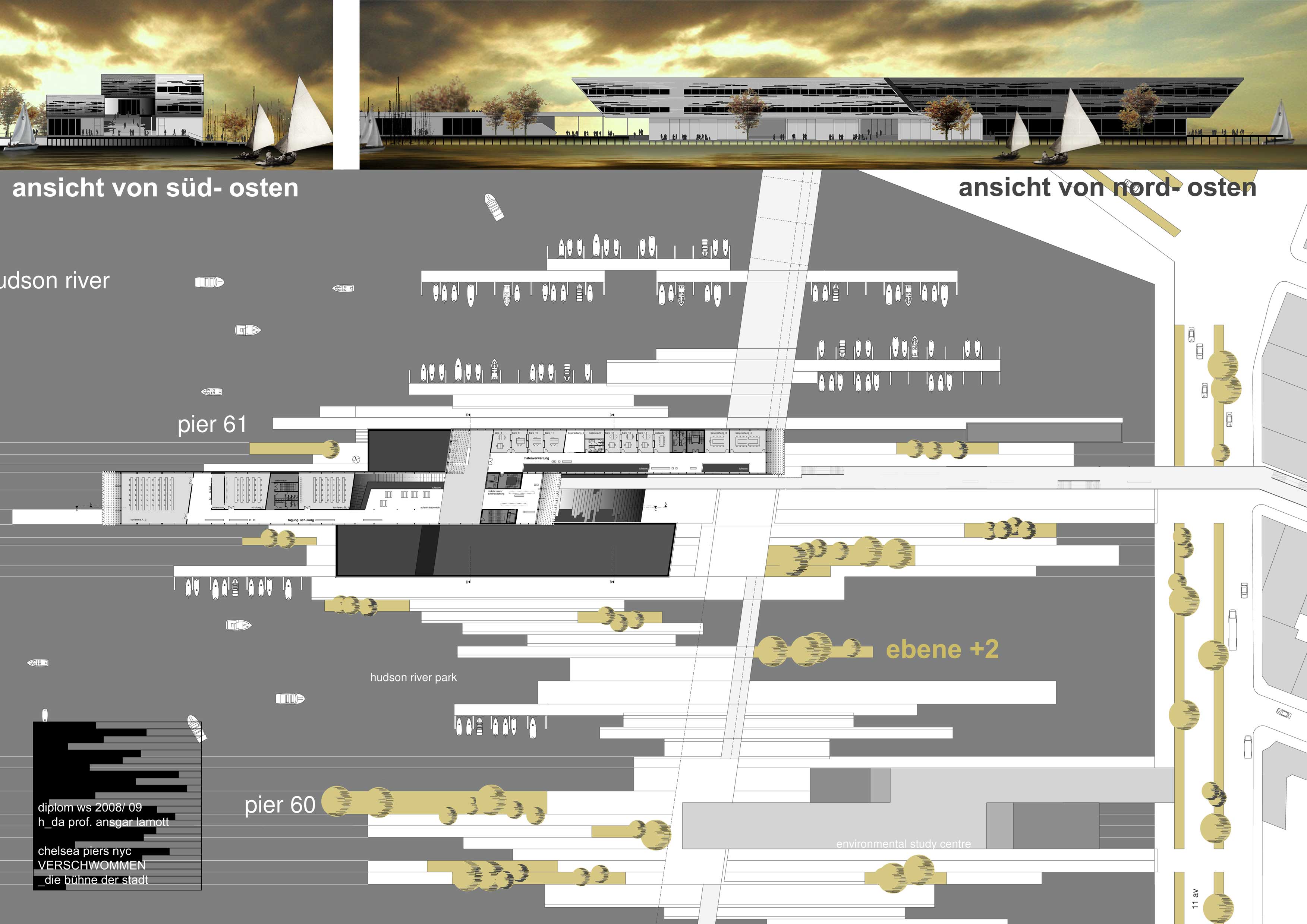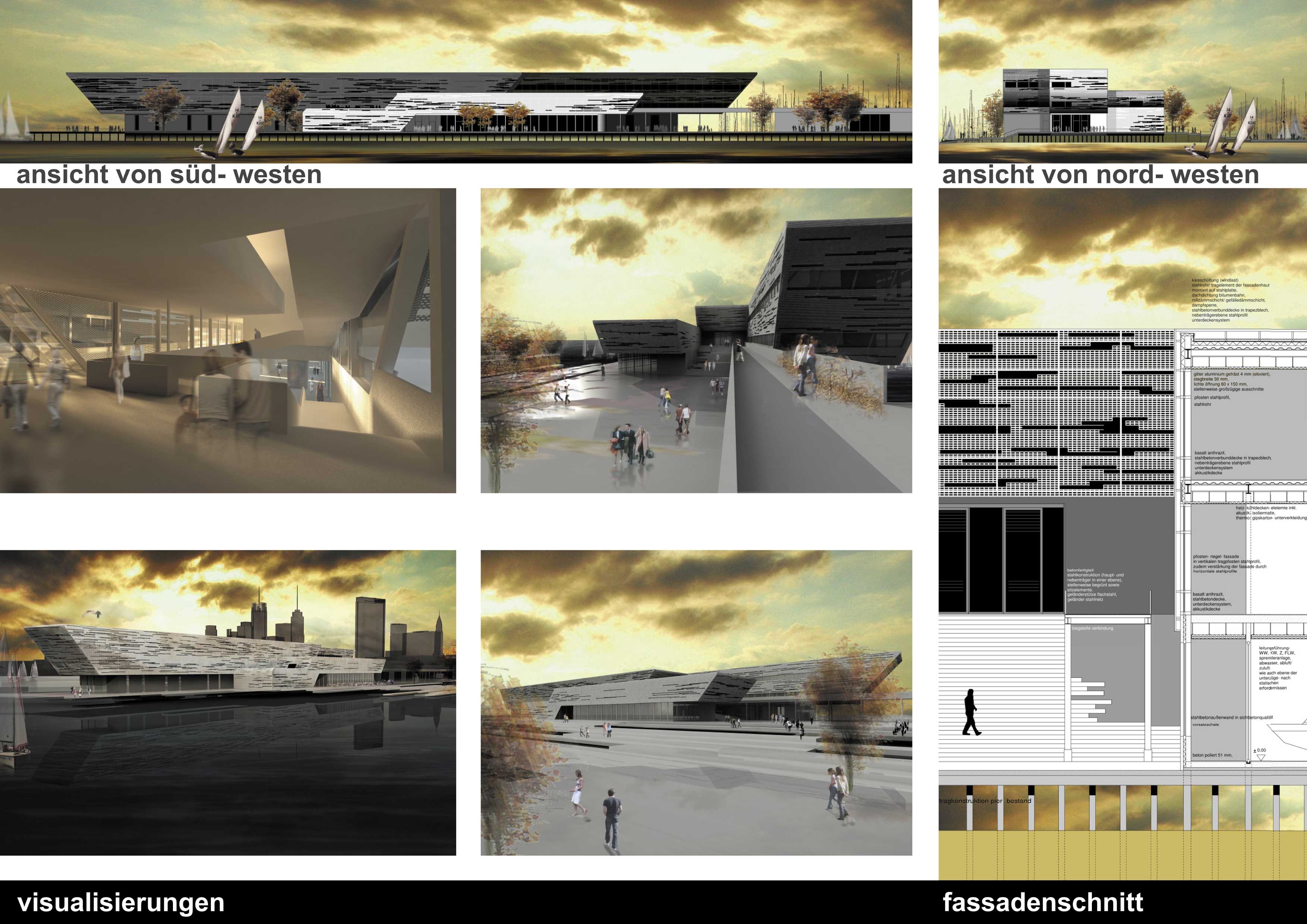 den Außenraum richten. Dem Public Space Park zugeordnet ist ein Restaurant über zwei Ebenen. Es steht sowohl der Öffentlichkeit als auch beispielweise Schulungsteilnehmern offen. Das Fährterminal ist aus Gründen einer notwendigen unbebauten Wasserfläche an der Spitze des Piers angeordnet. Zudem hält es dem Gedankengang stand eine Bewegung gen Wasser zu erzielen- der Baukörper dockt an Land an und schiebt sich zum Wasser. Dem Hafenbecken zugeordnet ist die Hafenverwaltung, gekoppelt mit dem Wartungsbereich. Sichtbezüge zu ankommenden/ abfahrenden Schiffen sind gewährleistet. Da in der Verwaltung auch Publikumsverkehr herrscht ist diese zentral angeordnet. Der Tagungs- und Schulungsbereich erstreckt sich über zwei Ebenen über dem Fährterminal. Durch einbündige Anordnung der Räume führt sich das „Bewegen auf Stegen“ auch im Innenraum fort. Der Außenraum ist immer präsent.