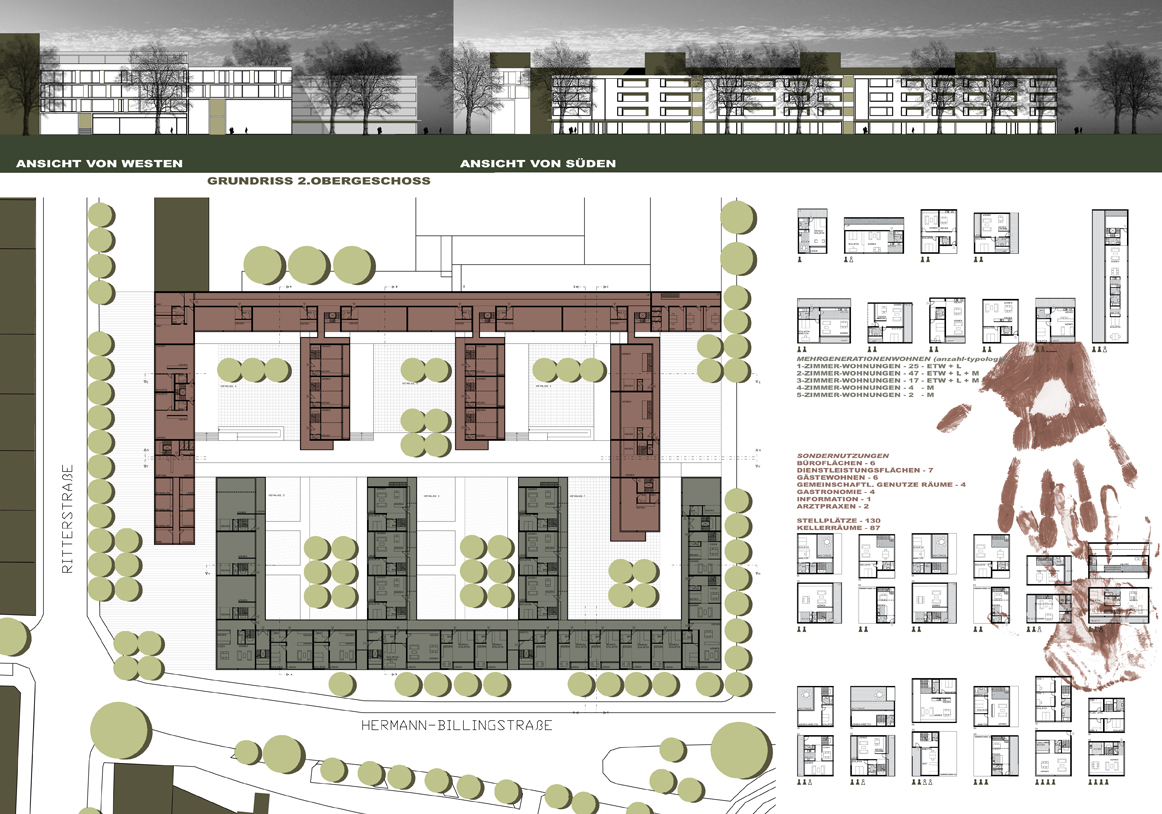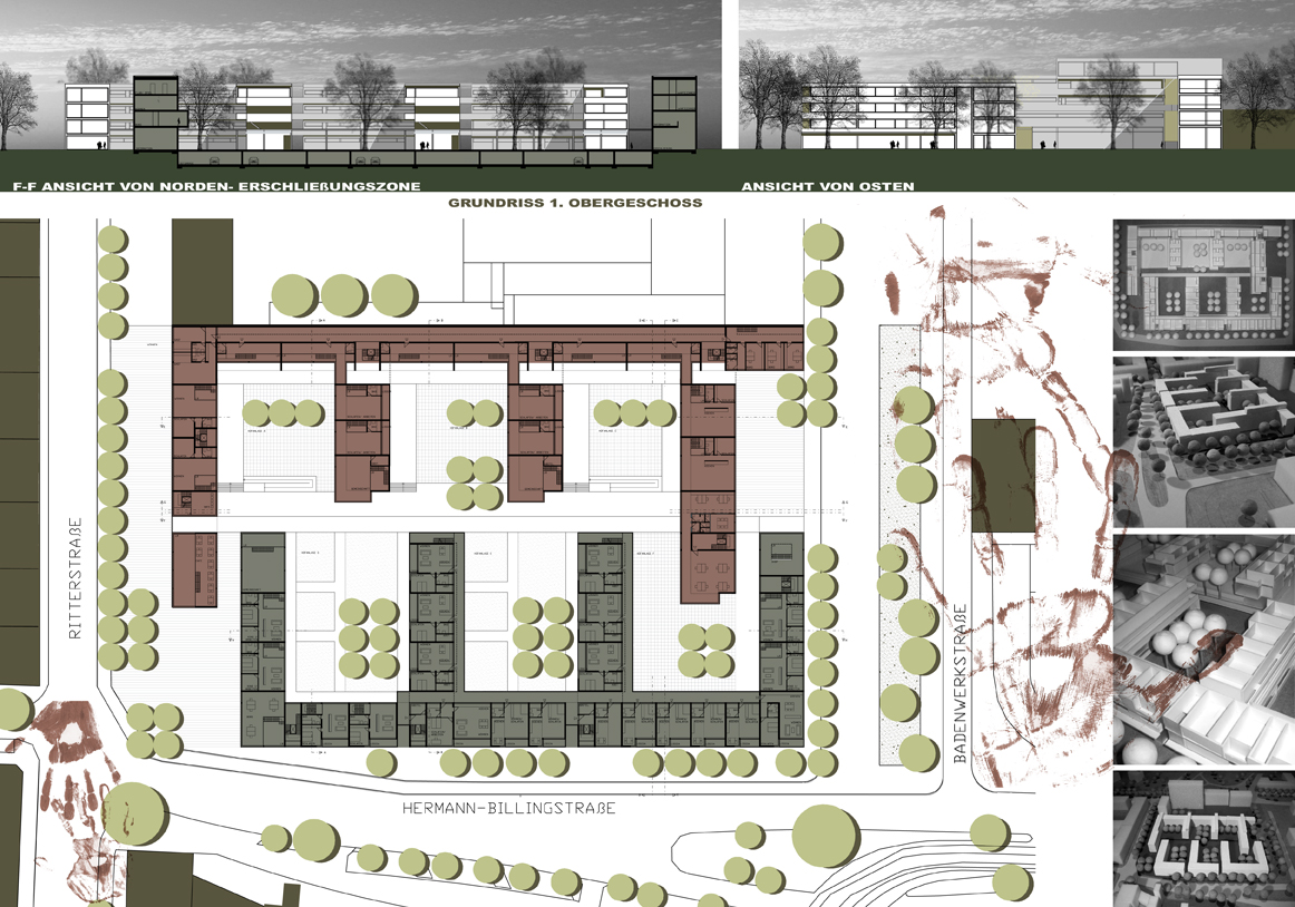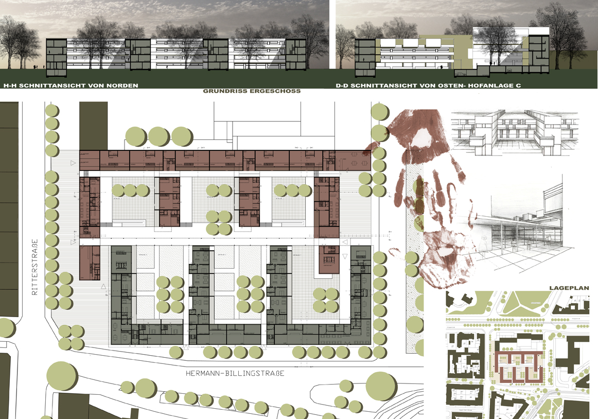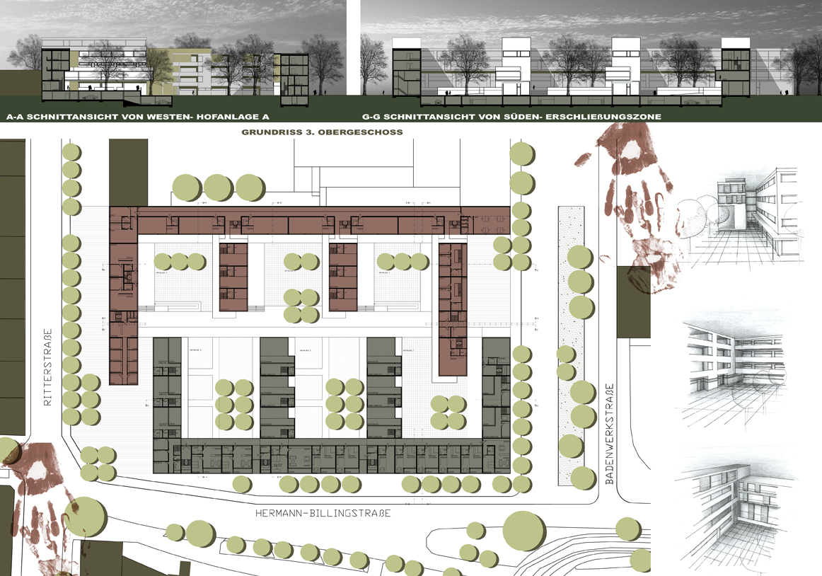Ziel war die Planung eines Mehrgenerationenhauses als städtisches Wohnen in Karlsruhe. Das zu bebauende Grundstück befindet sich im Stadtkern, südlich des Nymphengartens. Nördlich und östlich an das Areal angrenzend befindet sich ein Wohnungsbau. Die bestehende nördliche Bebauung wird nicht ins Sichtfeld gerückt, Abgrenzung zur Straße erfolgt. Die wechselseitige Bebauung lässt vielfältige Blickbezüge entstehen. Es wurden sechs kleinere Innenhöfe gebildet, welche anbinden an die mittig gelegene Erschließungszone. Diese verbindet zudem die zwei öffentlichen Plätze miteinander. Im nördlichen Teil wurde das Gebäudeniveau erhöht. Hier befindet sich die Tiefgarage, welche an den Bestand angeschlossen werden kann. Durch die Erhöhung des Niveaus entstehen unterschiedliche Hofcharakter und die beiden Baukörper/ Kämme können differenziert werden. An den öffentlichen Plätzen und im Süden gelegen, befinden sich Dienstleistungsflächen im Erdgeschoss. Um mehr Wohnfläche zu gewährleisten werden diese Flächen allerdings nur bis zur Mitte des Gebäuderiegels angeordnet um innenhofseitig Wohnfläche anzubieten. Die beiden sich ineinanderschiebenden Baukörper/ Kämme werden differenziert. Im nördlich gelegenen Kamm befinden sich meist Loftwohnungen und Maisonettwohnungen. Erschlossen über eine innenliegende Erschließung an den Gebäudefugen. Im südlichen Kamm Etagenwohnungen, erschlossen über Laubengänge. Bei fast allen Wohnungen- ausgeschlossen Maisonettwohnungen- ist die Barrierefreiheit gesichert. Zudem werden vier rollstuhlgerechte Wohnungen geschaffen. Neben einer großen Vielfalt an Wohnungstypen werden gemeinschaftlich nutzbare Räume angeboten. Große Fassadenöffnungen mit flächig, ebener Baukörperoberfläche stellen sich kleineren Fassadenöffnungen mit Subtraktionen/ Additionen an der Baukörperoberfläche entgegen. Eine weitere Differenzierung der beiden Kämme erfolgt über das jeweils letzte Geschoss. Im Norden eine punktuelle Baukörperaddition, im Süden eine Subtraktion.