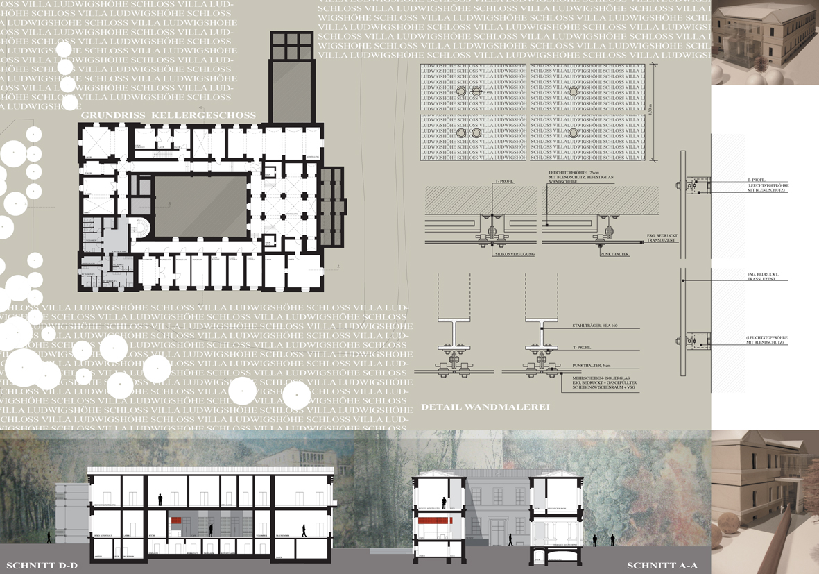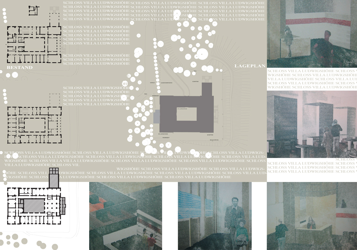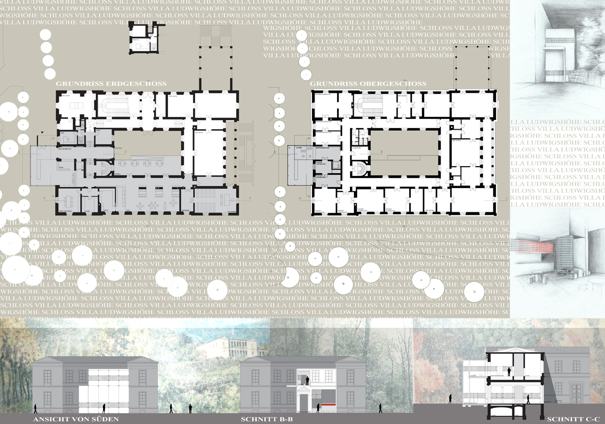Nach antiken Italienbild des Königs Ludwig I. verwirklichte sein Architekt Friedrich von Gärtner die Villa Schloss Ludwigshöhe. Bei Edenkoben an einem Berghang, genau am Übergang der Weinberge zum Pfälzer Wald, begann man 1846 mit dem Bau. Heute können die Besucher in dem Vierflügelbau unter anderem die repräsentativen Schlossräume besichtigen, Werke Max Slevogts einsehen, sowie abendliche Konzerte im pompejanischen Saal besuchen. Die Entwurfsaufgabe bestand darin unter Berücksichtigung der denkmalpflegerischen Vorgaben, eine „Orientierung" dem Besucher zu geben und ein neues Nutzungsprogramm in den südlichen und westlichen Gebäudeflügel einzubringen. Des Weiteren galt es die Barrierefreiheit einzuhalten.