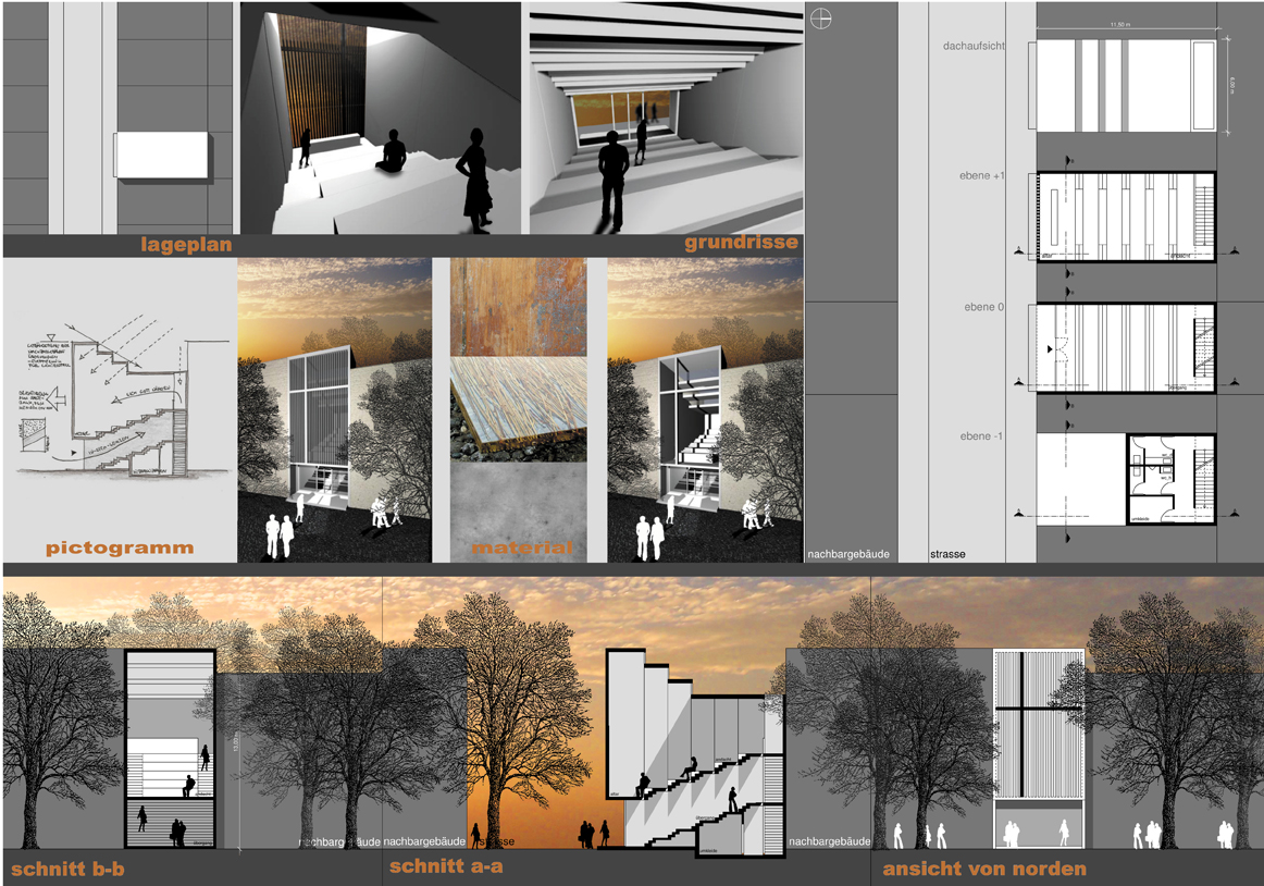 Ziel der Aufgabe war es auf einem innerstädtischen Baugrundstück mit minimalen Ausmaßen von 11,50 auf 6,00 m eine Kapelle zu entwerfen. Das zu planende Bauvolumen soll sich bei der Höhe an den Nachbargebäuden orientieren. Fensteröffnungen sind lediglich gen Süden, an der Straßenfassade gestattet. Sanitäranlagen sind erwünscht. Um den Altarbereich nach Süden orientieren zu können und den Besuchern eine Zeit des „in- sich- Kehrens" zu gewähren, wurde die gesamte erste Ebene als Treppe ausgebildet. Eine Art „Schlauch" zieht die Besucher in die Kapelle. Wenn der Besucher den Weg auf sich genommen wird er überrascht von einem lichtdurchfluteten, großzügigen Andachtsraum, der seine größte Raumhöhe im Bereich des Altars erhält. Das Tageslicht gelangt über Oberlichter in den Raum um dem Besucher die nötige Ruhe zu gewähren. Ein weiteres diffuses Licht wird durch die Materialität der Südfassade erzielt, und lässt ebenfalls keine Blicke zum Stadtraum zu. Der die Besucher einziehende „Schlauch" erhält oberhalb Aussparungen um ein gerichtetes Licht in den Eingangsbereich zu bringen. Im Andachtsraum dient der „Schlauch" als Sitzelement. Fließende Situationen entstehen.